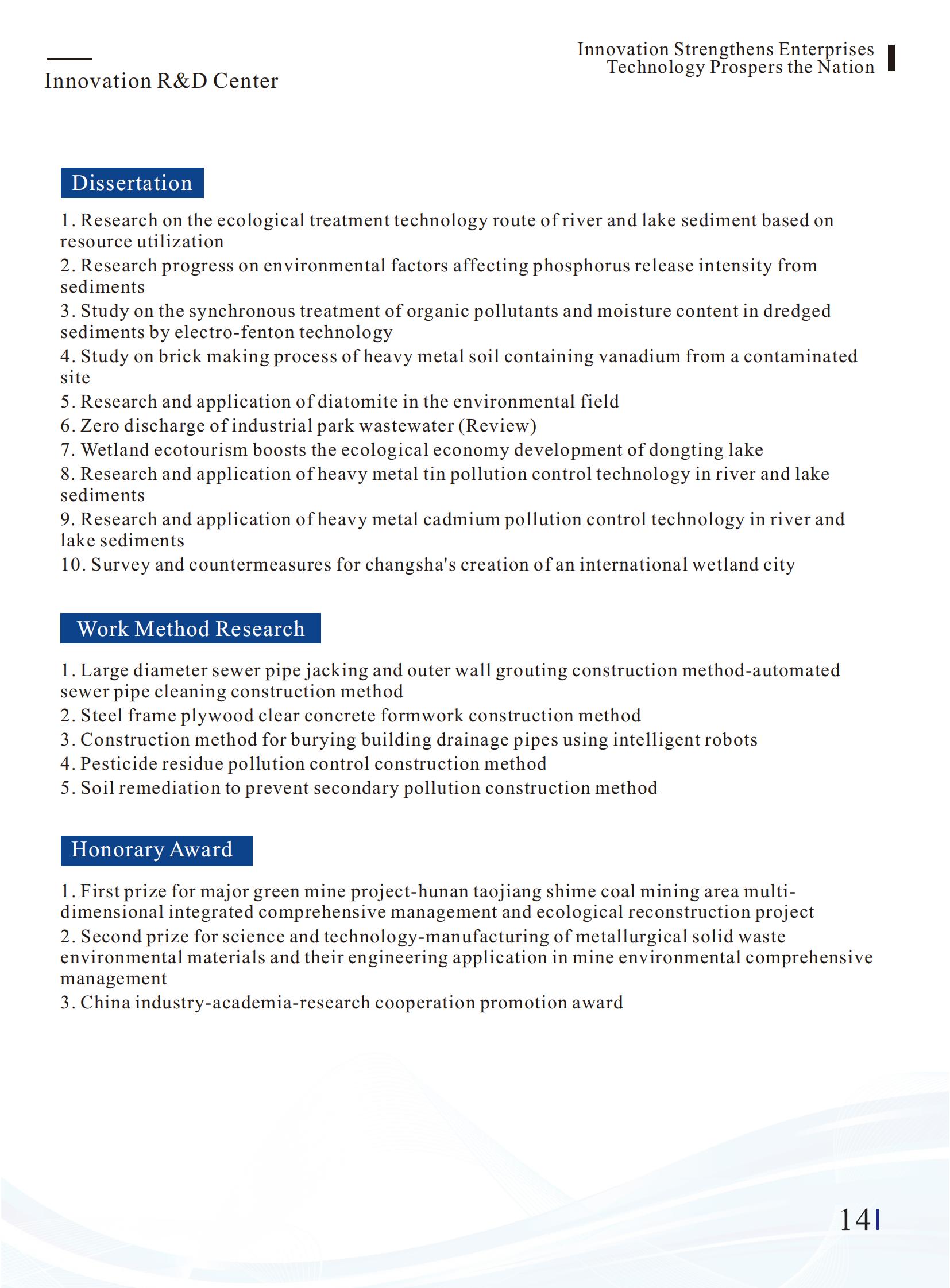 2024年全国企业“创新增效”TOP50行动最具转化价值奖--河湖底泥资源化协同矿山生态修复关键技术 2024年度中国环境保护示范工程(庐山如琴湖水生态保护修复项目) 2024年度中国环境保护示范工程(邵阳市洋溪桥污水处理厂外水体黑臭问题整改及雨污管网提升工程) 2024年度科技进步项目奖 2024年度中国生态建设设计示范奖